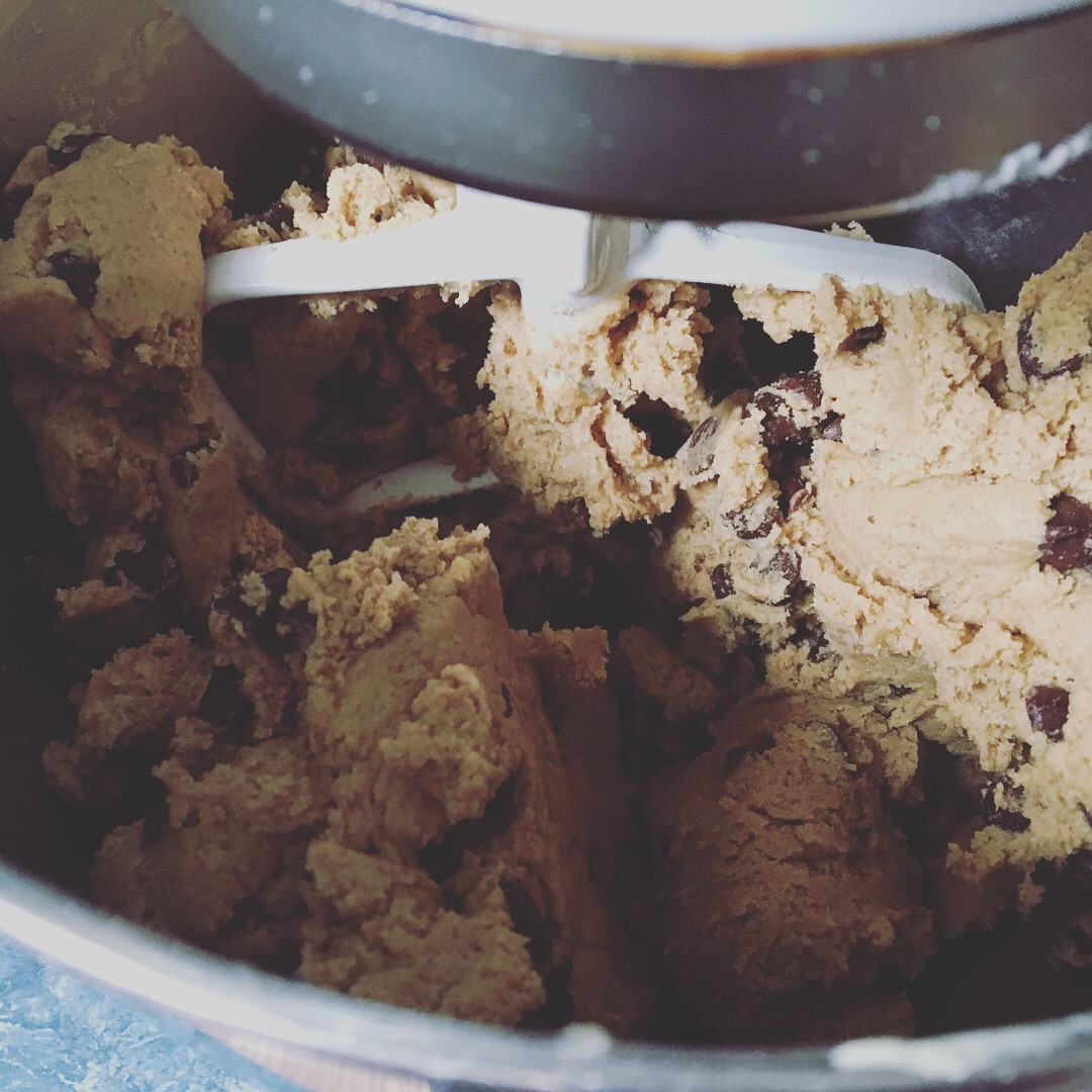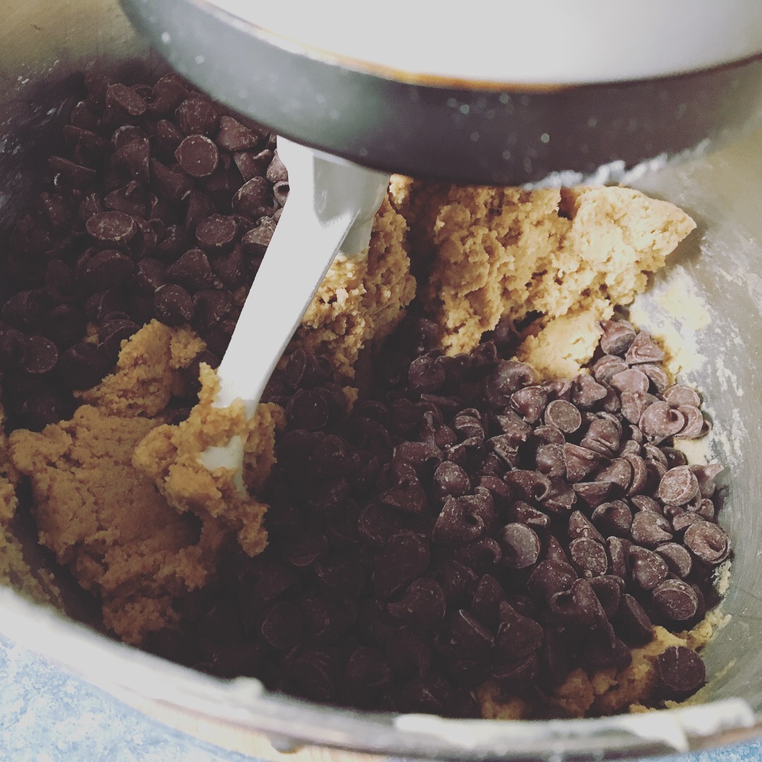Mix flours, baking soda and salt in a bowl, set aside. In a mixer, combine butter and sugars and mix on medium high for 2 minutes until fluffy. Add the eggs and vanilla. Mix until well combined and smooth. Add dry ingredients and mix on low-medium until it comes together. Add chocolate chips and mix on high for a few seconds to incorporate.