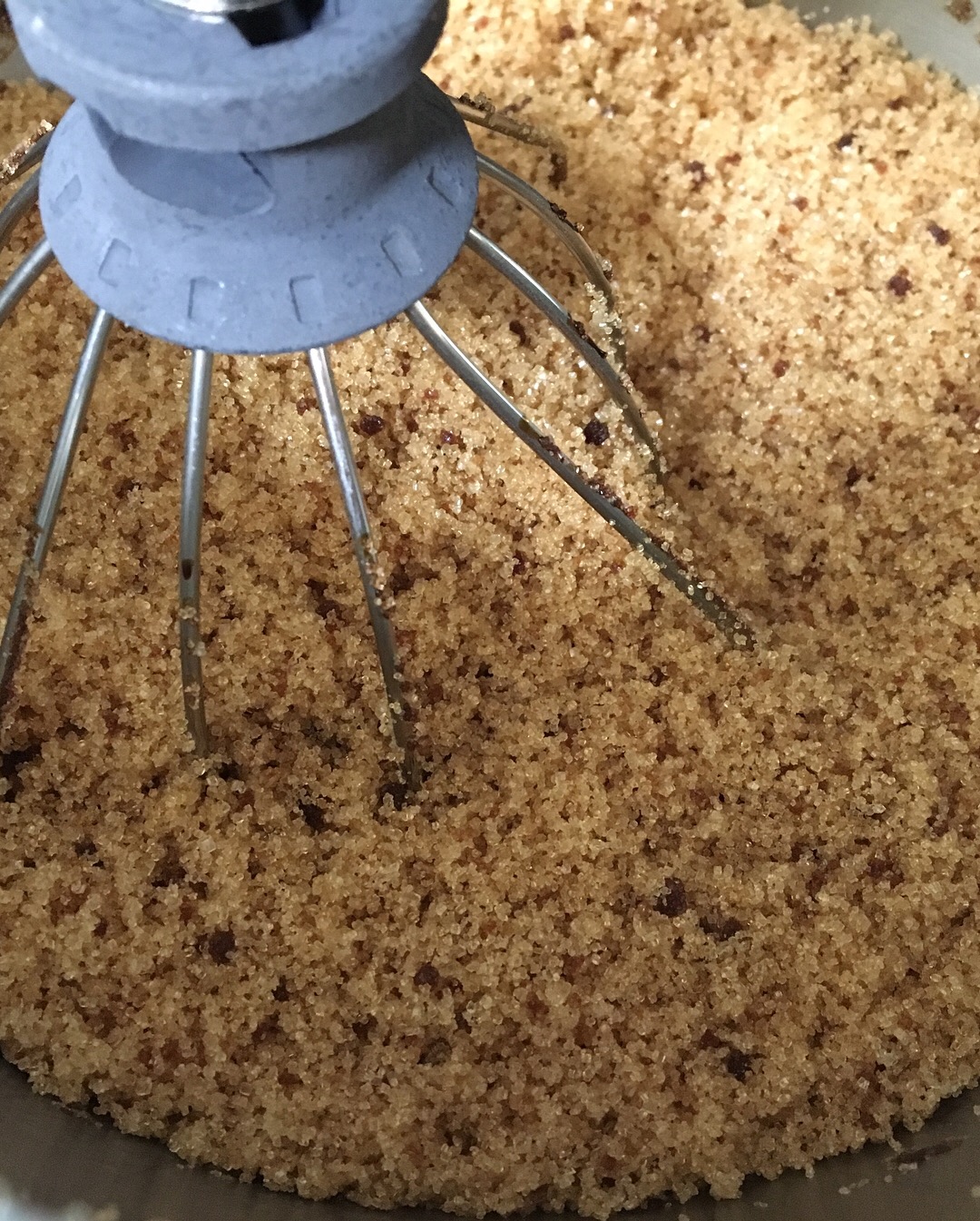 Place sugar in your mixer. Turn it on medium-high speed and slowly drizzle in the molasses. How much molasses you put in depends on if you want a light or a dark brown sugar. Turn the mixer to the highest speed. There may be a moment when you feel like it isn’t working, but give it a little bit longer until the molasses is fully incorporated. You will know it is done when is has turned a light or medium brown, is fluffy and there are only small specs of molasses remaining.