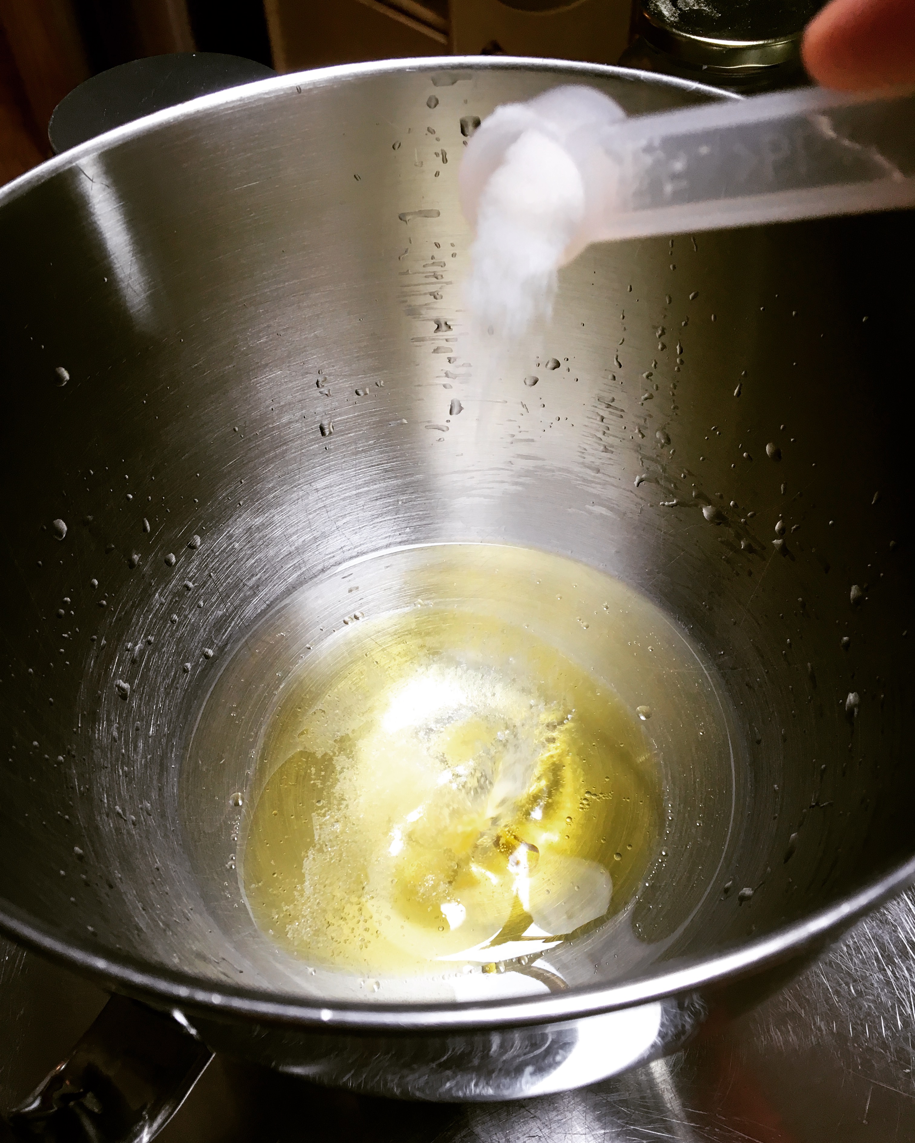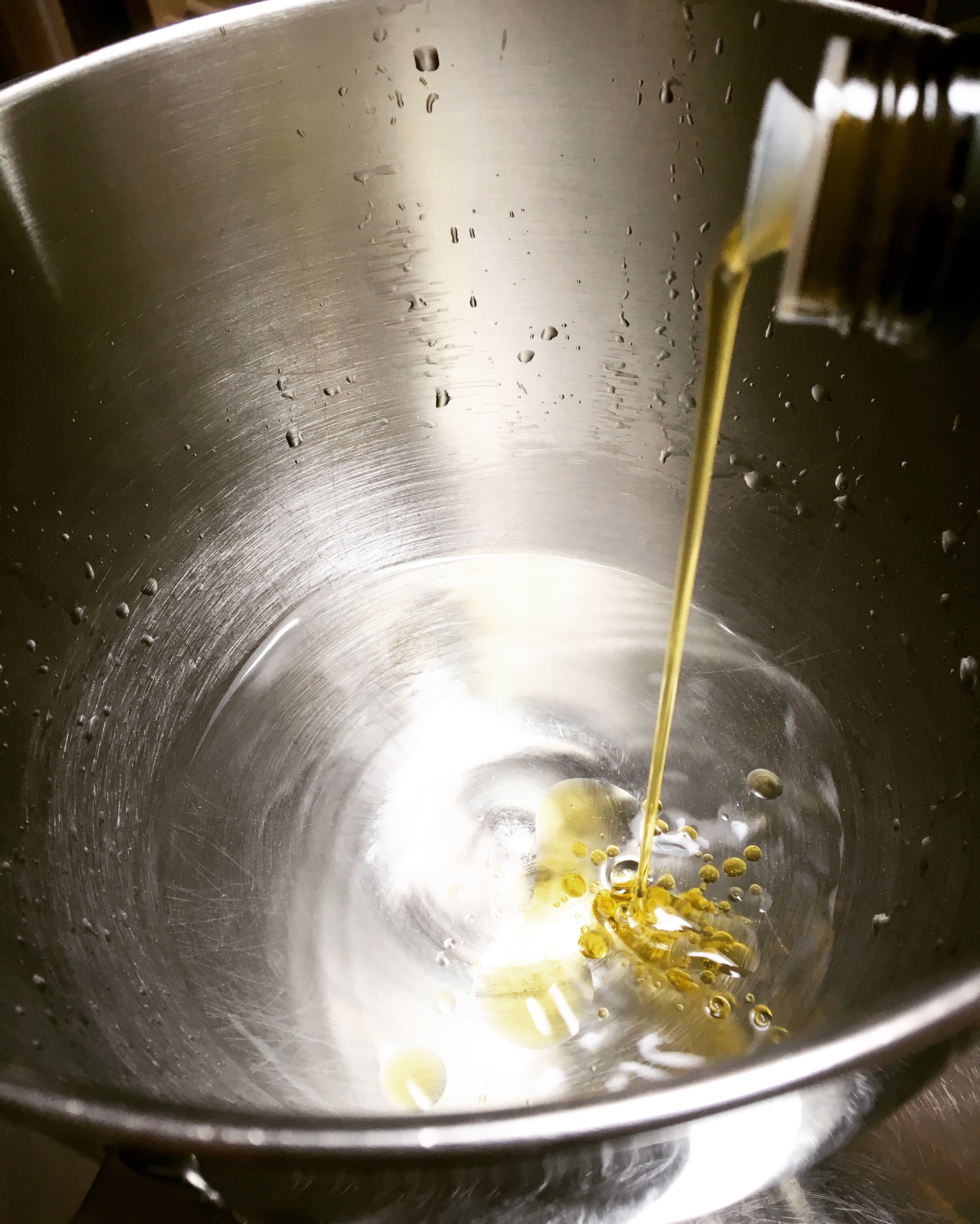 Add the water to your mixer bowl. (You can also mix by hand if you don’t have a mixer) Add the salt, olive oil and the honey and gently stir until the honey is dissolved.